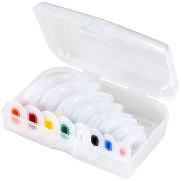 Estojo plástico transparente. Cabem todos os oito tamanhos de cânulas juntas dentro do estojo.